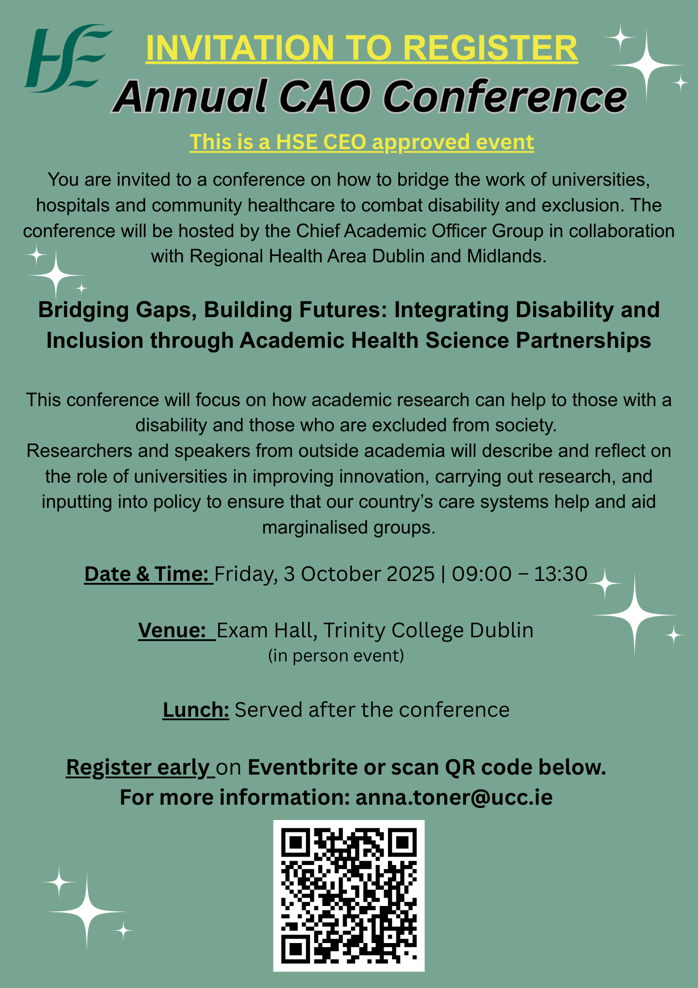 The annual national Chief Academic Officer's conference will be held on 3rd October at Trinity College Dublin. This year's conference focuses on the positive impacts of innovation and academic research on the lives of those living with a disability and those excluded from society.