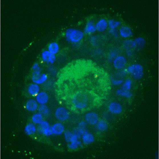 Pic: Confocal laser scanning micrograph of a bovine primordial follicle following in vitro culture with green fluorescent labelled 100 nm polystyrene beads.