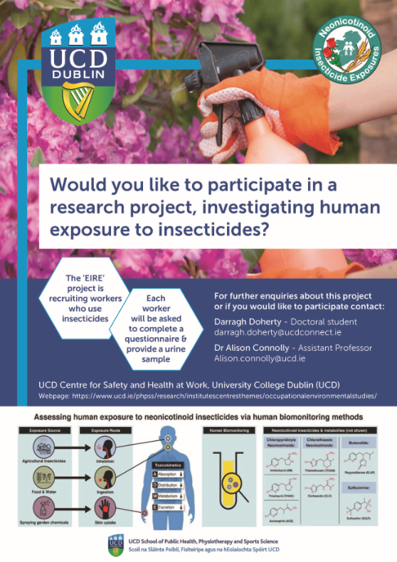 The EIRE study is a study of exposures to neonicotinoid insecticides among the Irish population using a human biomonitoring strategy. Dr Alison Connolly, Assistant Professor in the UCD School of Public Health, Physiotherapy and Sports Science, is the lead for the study.
