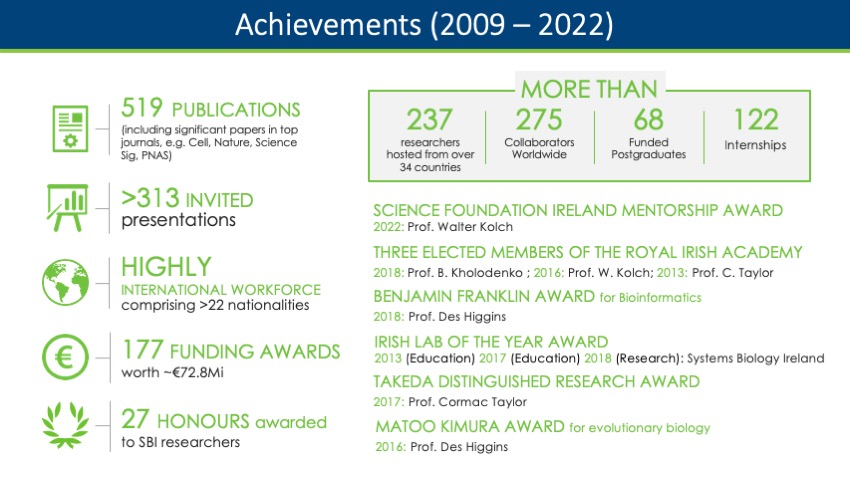 Since its launch, SBI has gained national and EU funding to coordinate or contribute to over 1700 under its research brief that realise concept development through to translation and application, in collaboration with industry and other partners. One such programme led by SBI is Precision Oncology Ireland – the largest cancer research programme in Ireland – which unites the efforts of five universities and associated hospitals and many more charity and industry partners.