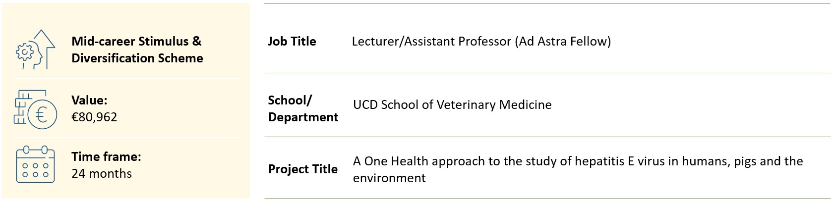 I feel this award was critically important for me to re-establish my research career, and to gain critical data to allow me to successfully apply for a larger award. Without the ISSF, I would not have been able to optimise cell culture models and establish collaborations with Prof Wim Meijer to generate preliminary data that it is possible to detect HEV in environmental samples. Importantly, I also think that writing a successful ISSF application gave me the confidence to build on this application and successfully write an EU H2020 and an SFI Frontiers for the Future proposal. As I re-started my research career as a veterinary surgeon with a passion and drive to conduct clinically relevant zoonotic infectious disease research, I feel that this award has helped me immeasurably.