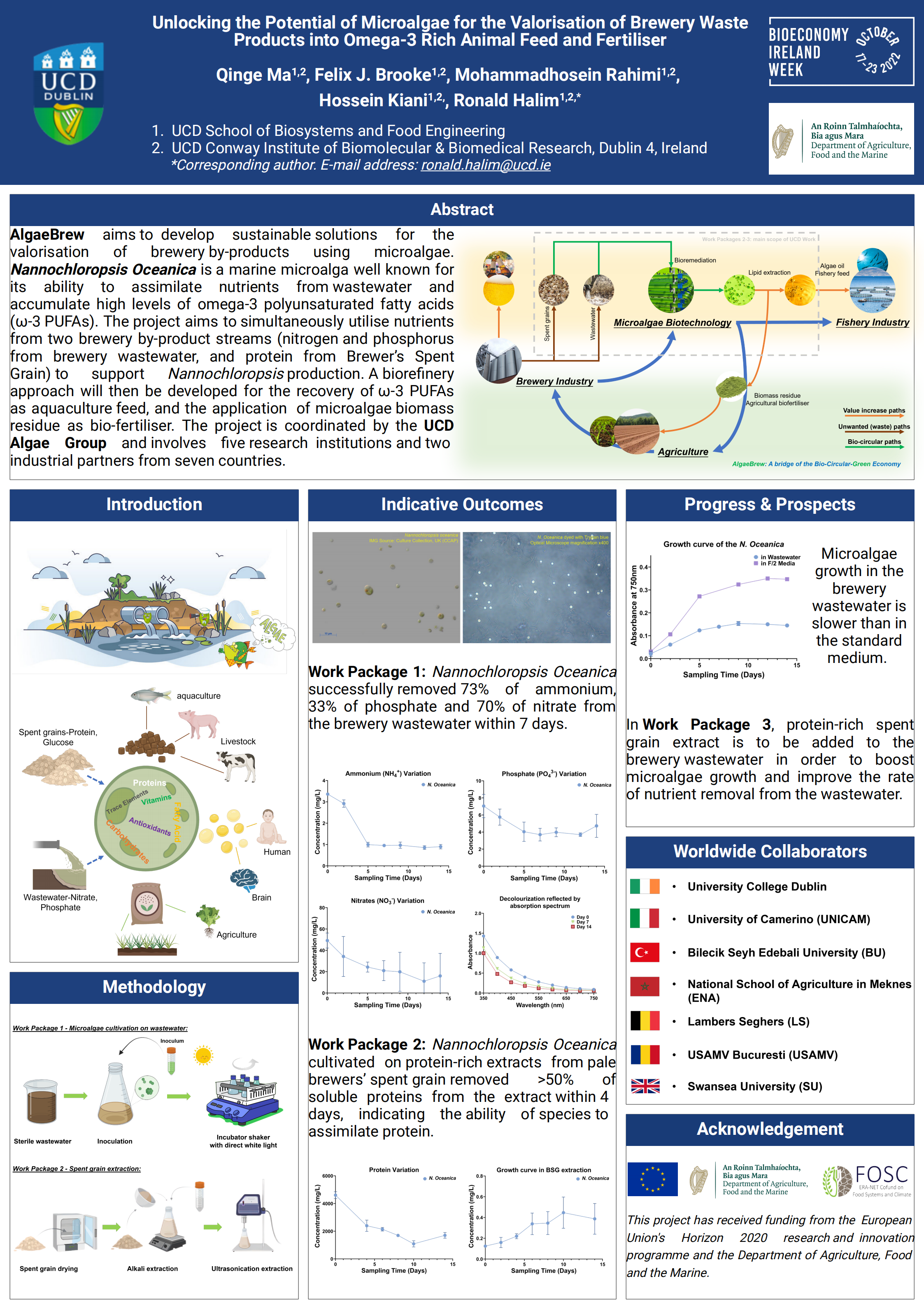 On October 17th, 2022, the UCD Algae Group was invited to present the poster on the AlgaeBrew project by the Department of Agriculture, Food and the Marine (DAFM) of Ireland, for DAFM’s Bioeconomy Research Symposium event, which also marked as the launch event for Bioeconomy Ireland Week 2022. The event took place in Backweston Laboratory Campus, Celbridge, Co. Kildare, Ireland.