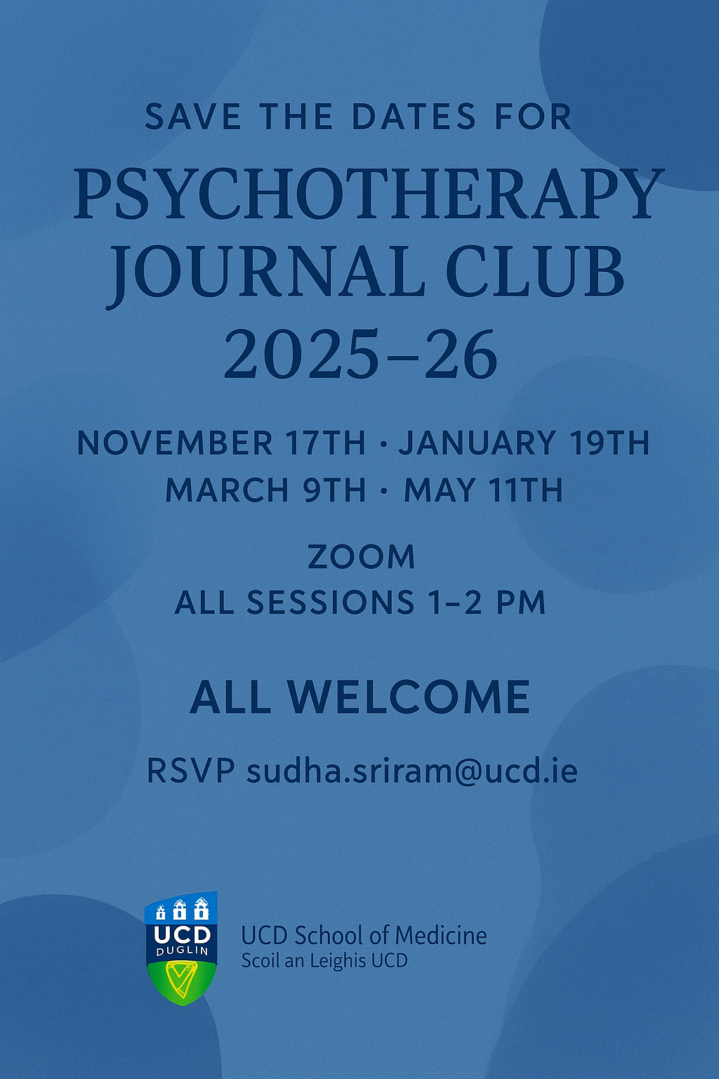 The Psychotherapy programmes at the School of Medicine are delighted to invite all faculty with an interest in or curiosity about the field of psychotherapy to our quarterly online lunchtime journal club. The next three dates are as follows at 1-2pm: