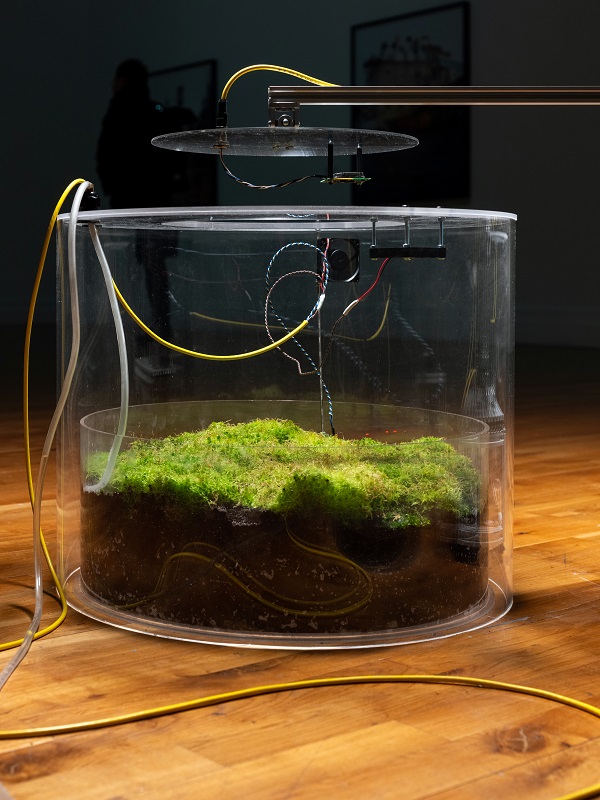 Sphagnum moss is central to bogs’ capacity to sequester carbon. For the work, Fiona got some culture sphagnum, or plugs, being used for restoration, from Bord na Mona. She was concerned about how to keep the moss alive for the duration of the exhibition and while at UCD sought advice from Noeleen Smyth in Horticulture.