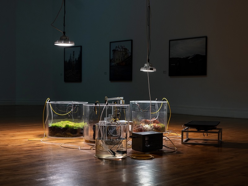 The installation comprises three transparent chambers arranged in a circle. Two chambers host living sphagnum moss ecosystems, while the third holds bare peat, representing a degraded bog. These ecosystems are alive, dynamic, and constantly exchanging gases with the air around them. Healthy sphagnum moss sequesters CO2 during photosynthesis, while bare peat emits carbon dioxide.