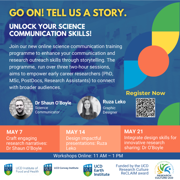 The UCD Institute of Food and Health, the UCD Earth Institute, and the UCD Conway Institute—supported by funding from the UCD Research Culture ReCLAIM award scheme—are launching a new science communication training programme to upskill our research communities through storytelling.