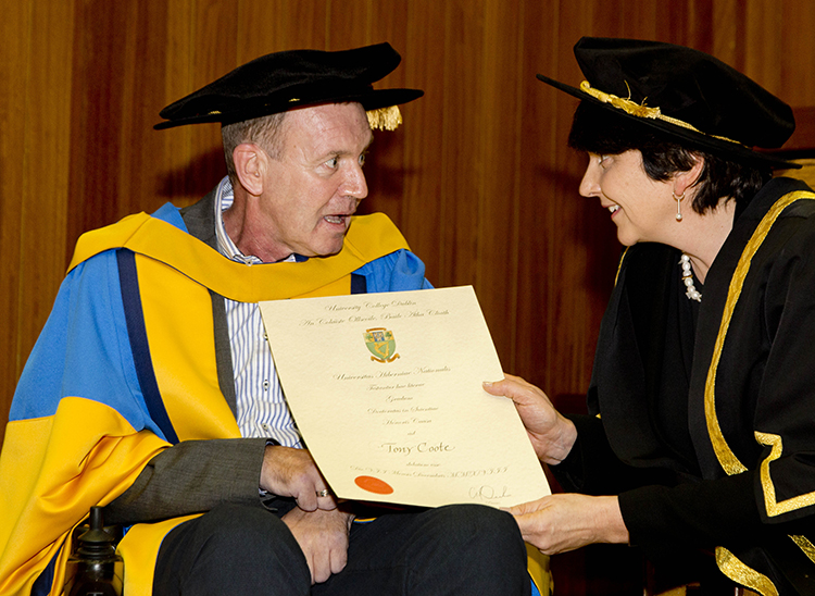 “Tony has always given his life to support those in need, in communities in Ballymun, in UCD, in Mt Merrion, Ireland, Haiti, India and many other places,” he said during his citation.