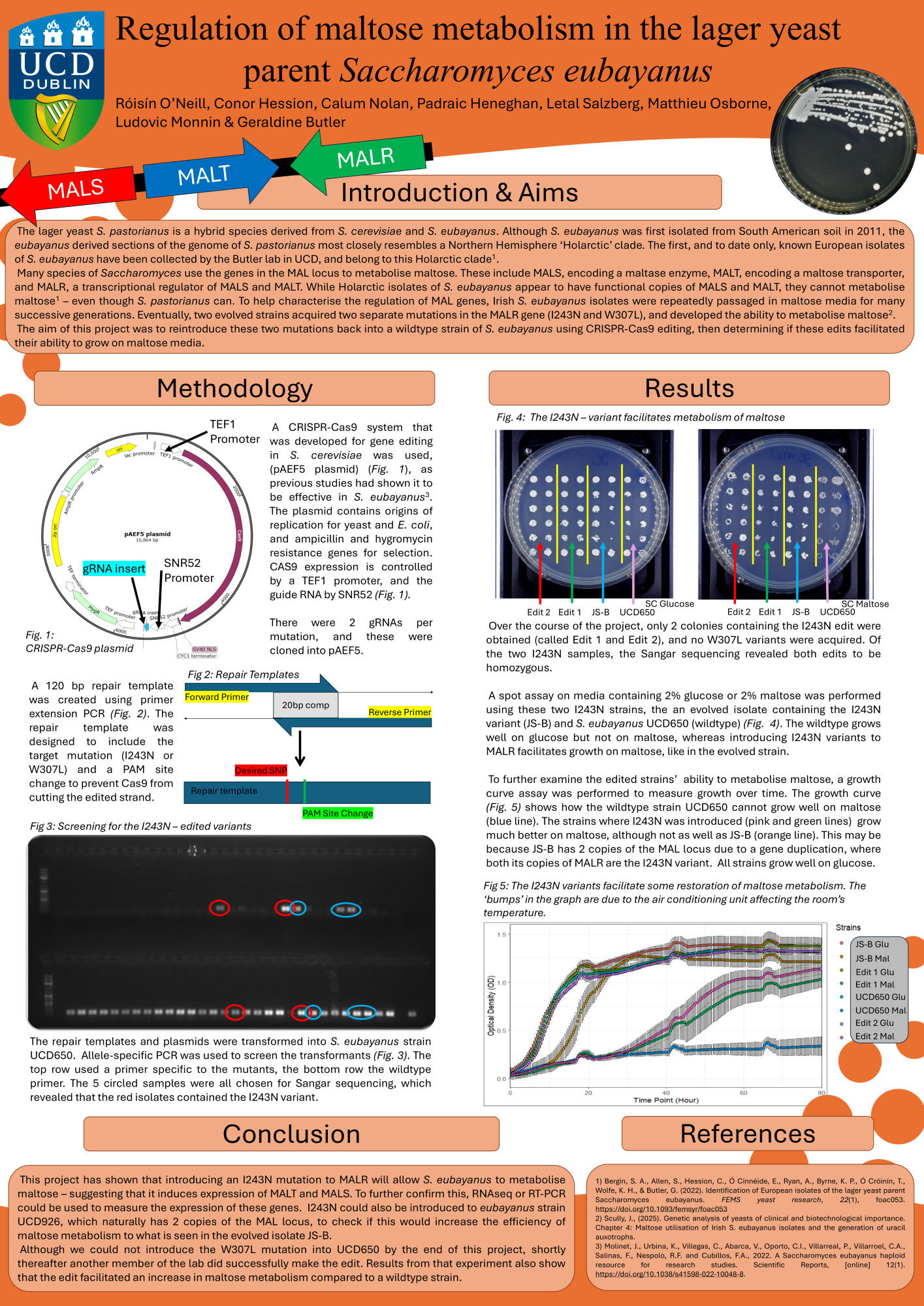The highlight of the project was definitely when we proved our hypothesis - after introducing the mutation into the gene that regulates maltose enzymes, our growth assays showed us how the edited cells could metabolize maltose much more efficiently than the wildtype strain. I loved being able to work towards this goal in the lab, then achieve the result we were hoping for by the end of it - this was certainly one of the largest projects I’ve worked on thus far in my degree so to see it all come to fruition was very rewarding.