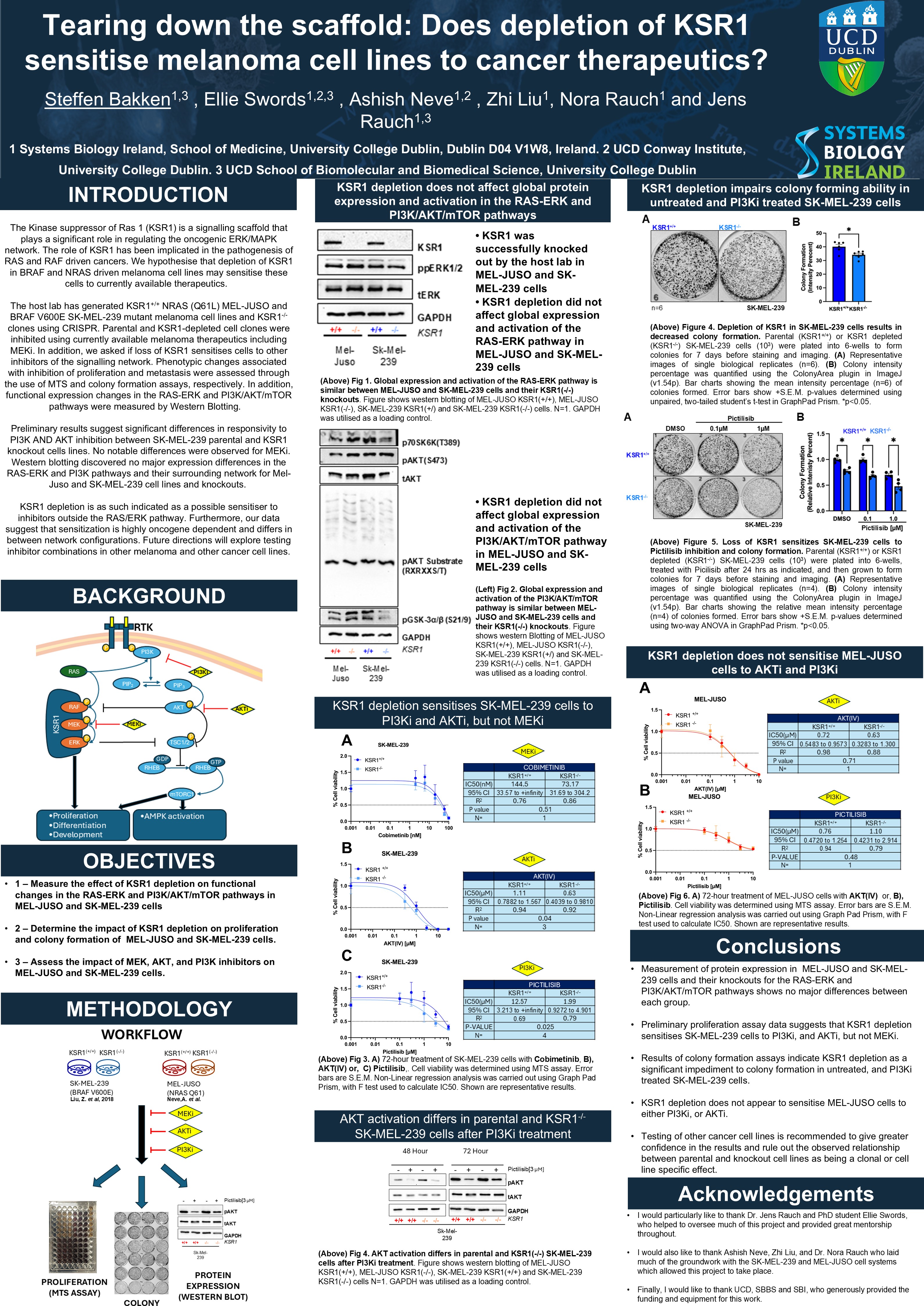 This summer, I worked on an 8-week research project in Systems Biology Ireland alongside my supervisor Dr. Jens Rauch, and his PhD student, Ellie. We were investigating how the depletion of a protein called KSR1 might affect melanoma cell lines, with the hope that it would make them more sensitive to existing therapeutics. Drug resistance in melanoma is a major issue, and as such the discovery of a sensitising agent could have real clinical value.