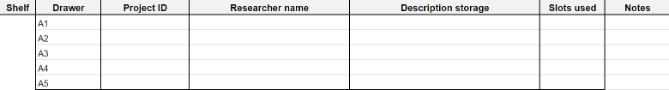 The process began with a thorough assessment of the requirements and functionalities essential for efficient tracking and management of samples within the freezer. This involved identifying key data points, such as sample type, location, storage duration, and researcher information. These details were formulated in an excel file, tailored to accommodate researchers’ needs while ensuring usability and scalability. This excel-based system will allow the clinical research nurse to efficiently track and log samples stored in the freezers. As seen in figure 1, the storage tab of the excel file details the shelf, drawer in freezer rack, project ID, and researcher. Each drawer has a capacity of 4 boxes, with monitoring in place to track the space available. Each shelf is assigned an alphabetical code (e.g. A,B,C), with all racks in that shelf labelled accordingly. For example, the TSX600V freezer accommodates six racks per shelf, with drawers labelled A1 to A30.