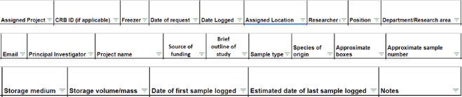 The first component of this system is a request for sample storage form for the ULT freezers. Each project was assigned a distinctive study identifier for internal tracking and management purposes. This form captures supervisory team, project and sample details. Overall, the form serves as a comprehensive record-keeping tool to facilitate the proper storage and tracking of biological samples, assisting in data management and complying with relevant ethical regulations. Details from this form were used to populate a second tab in the excel file, detailing each individual project and allocated storage space (Figure 2).