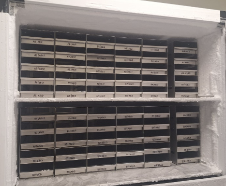 Additionally, a recycling program for sample storage boxes was established, ensuring that materials were repurposed rather than discarded, thus contributing to waste reduction and promoting a circular economy model. Furthermore, by salvaging and repurposing 50 freezer racks from landfill, waste was mitigated but also enhanced storage efficiency within the schools facilities, benefiting a number of research groups. These repurposed racks allowed maximizing of freezer space (Figure 4), facilitating better organization and accessibility of samples while minimizing energy consumption. Excess racks were distributed to a number of research groups to allow for efficient storage mechanisms across UCD School of Veterinary.