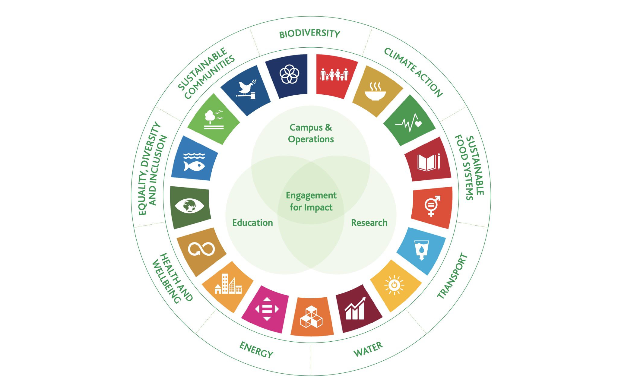 Our objectives focus on research, innovation and impact for the SDGs, action for climate change and biodiversity, fostering climate resilience, empowering staff and students, using the campus as a living lab and embedding sustainability in the governance and policy of the university.