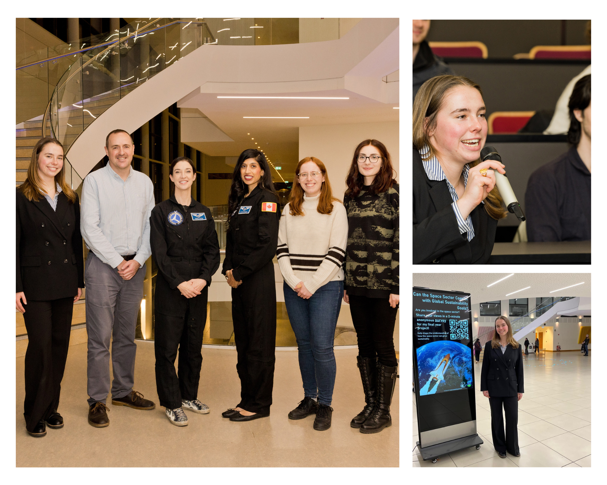 Pictured above left: Melora Costello, Dr Nicholas Brereton, Dr Norah Patten, Dr Shawna Pandya, Michaela Walsh and Stefania Sabau at UCD Space Event, November 2025. Top right: Melora during audience Q&A. Bottom right: Melora presents her research in UCD O'Brien Centre for Science.