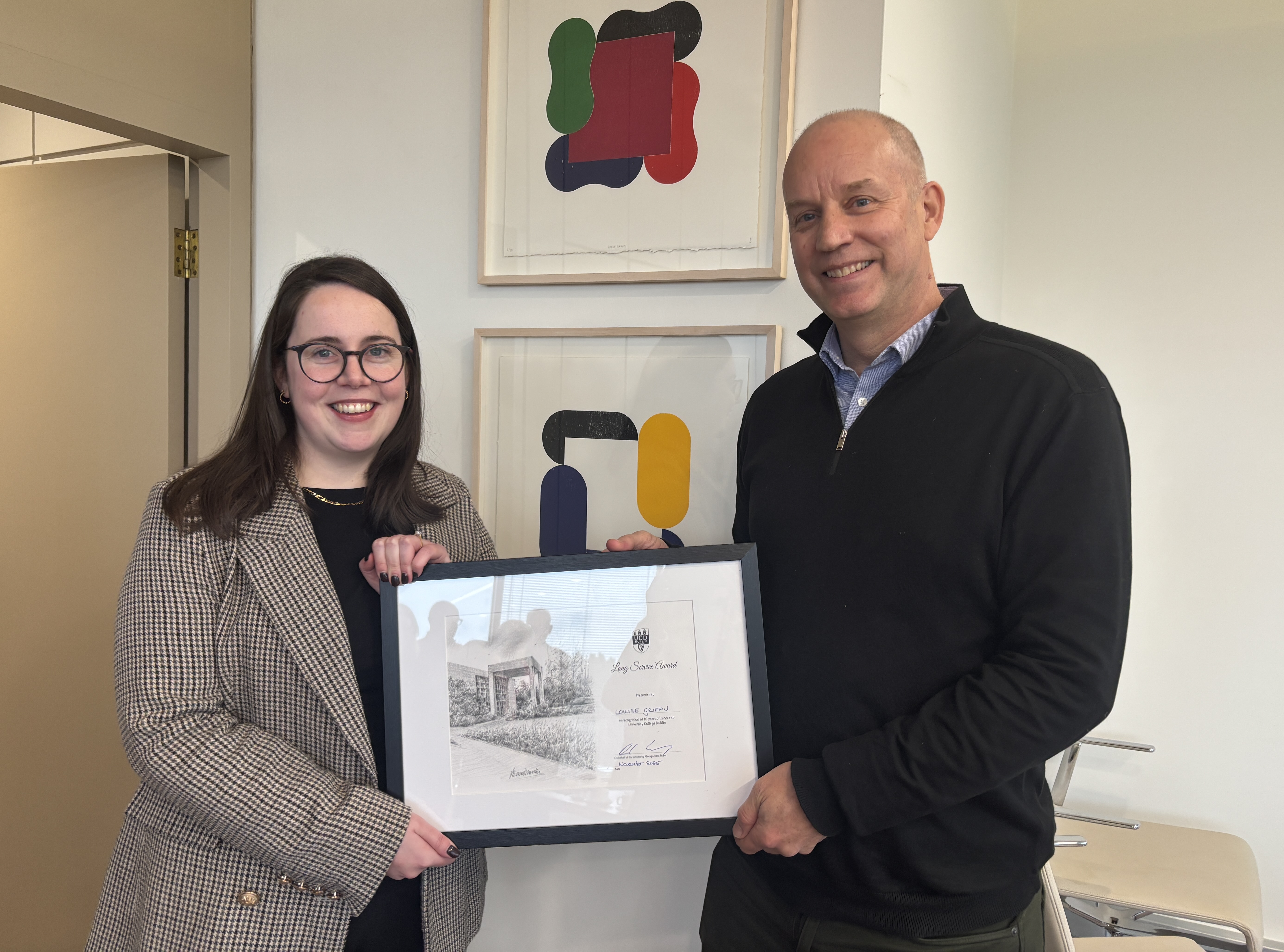 Congratulations to UCD Sustainability manager Louise Griffin who was presented with her Long Service Award (ten years) this morning by University College Dublin Vice President for Sustainability, Professor Tasman Crowe (both pictured above).