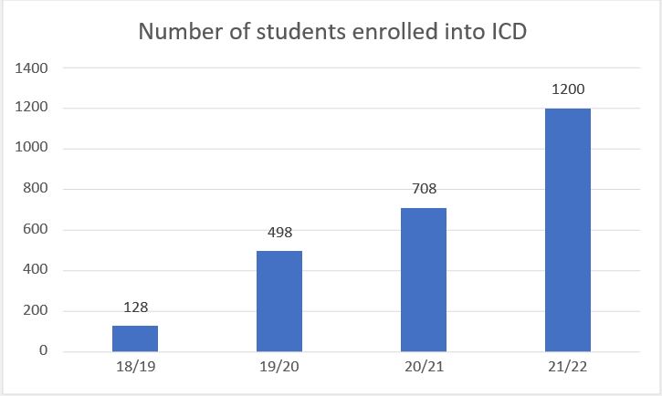 ICD has been in high demand since its establishment in 2018. Numbers have grown from 128 in the first year of operation, to 498 in 2019/2020, and then in 2020/2021 to a record 708 students, with students drawn from more than 30 nationalities and across 21 MSc Programmes. The top three nationalities are 35% Irish, 27% Indian, and 21% Chinese and the gender balance is 61% female and 39% male.