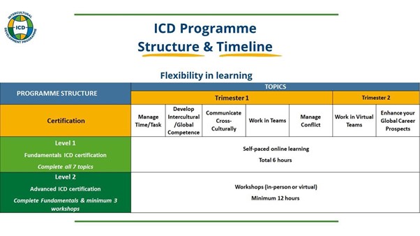 To ensure all students have equal opportunity and the flexibility for intercultural learning, I have adopted a blended approach combining online delivery and in-person delivery. As shown by the programme structure and timeline diagram below, there are two levels of ICD, namely Level 1 Fundamentals ICD and Level 2 Advanced ICD. This structure offers flexibility for students to choose the approach that fits their learning style and schedule the best.