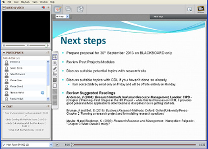 Two online additional workshops were then delivered at times when students traditionally required additional support and were not scheduled to attend class. One week prior to the deadline for the research proposal (and two weeks after the first class), a Collaborate session was delivered in the evening time to provide some general reminders on the proposal specification and also to address general queries. Collaborate, is the virtual classroom that is currently available in UCD which enables voice, video and text interaction between students and lecturers in a virtual classroom environment. This provided an online environment which allowed students to log in from any location which suited the part-time nature of this cohort, who would be otherwise challenged to attend an additional workshop on campus. A second online workshop was delivered two weeks prior to the draft submission of the project. It provided students with some general reminders regarding the preparation of the final submission and addressed the general queries. In both instances, many students had similar queries and benefitted from the opportunity to discuss these queries collectively.
